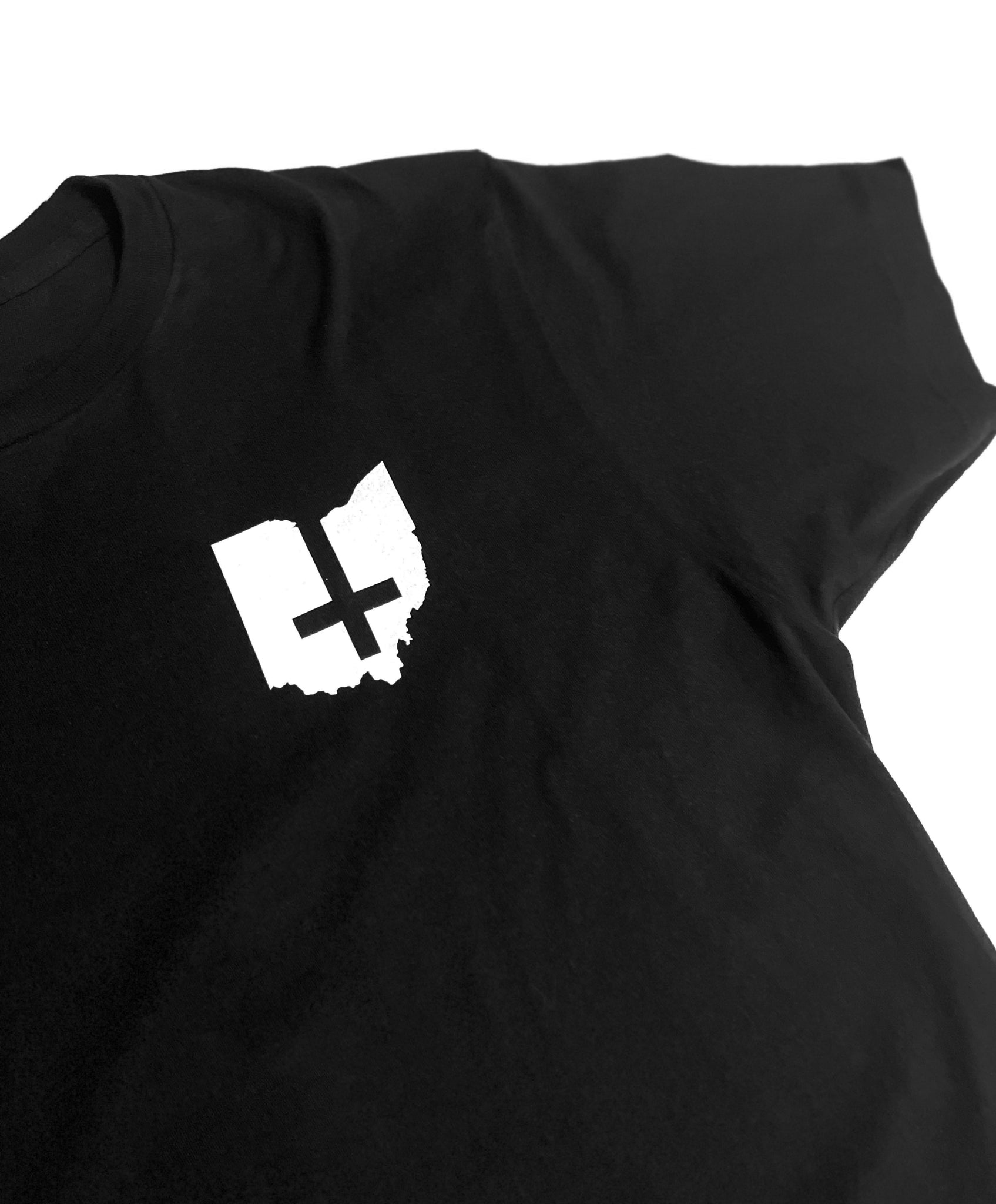 Like our Hell (in) Ohio back print shirt but inverted. This tee features a Petrine Cross on the left chest and our standard logo on the back.